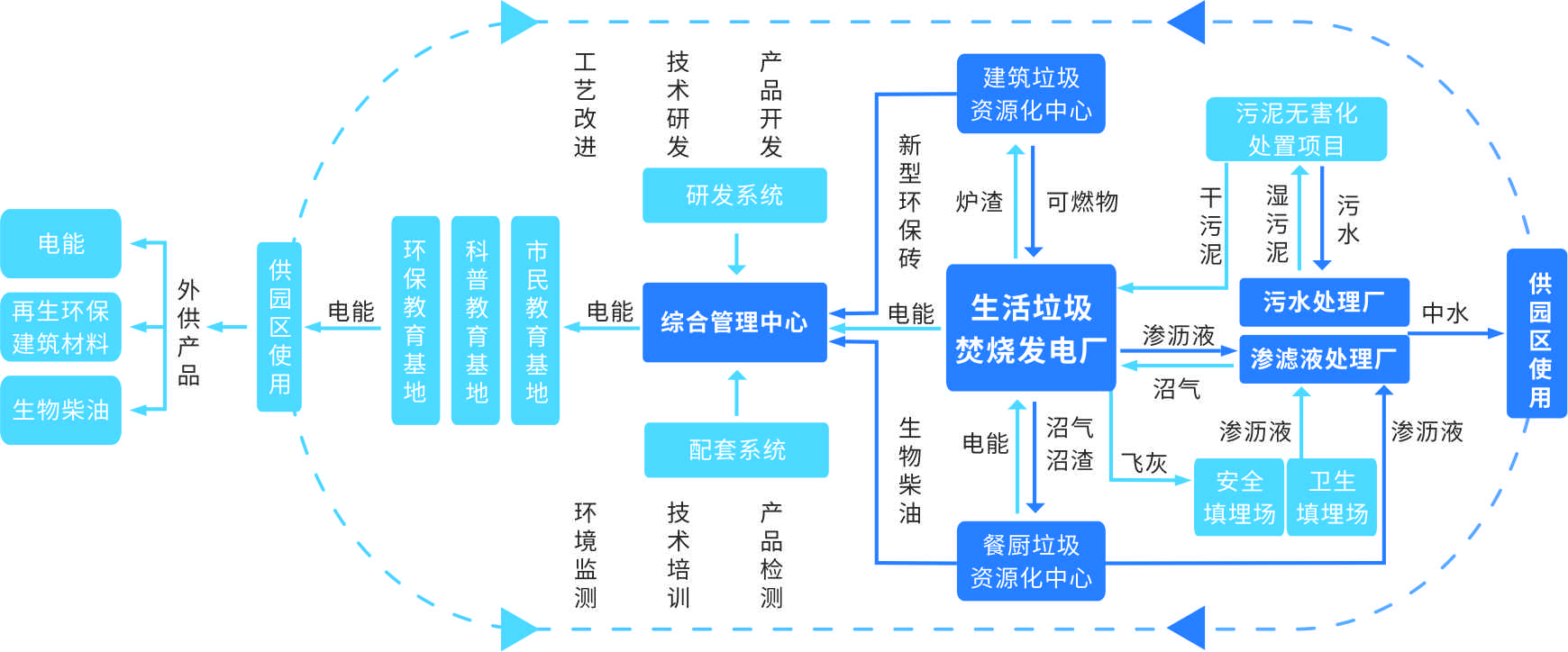 今年会环境循环经济产业园模式以生活垃圾焚烧发电厂为园区核心,统筹各类生活垃圾处置中心的配套建设,对各类生活废弃物进行无害化、减量化、资源化处理,输出电能、建筑材料、生物柴油等副产物,为园区生产、生活提供服务。